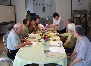 終演後、コーヒーと手作りケーキをよばれてみなさんとお話しする。最高齢は94のおばあちゃん。みんな元気でおしゃべり好きな人たちだ。老人ホームでよく見られる、呆うけた表情はない。しっかりと話がはずむ。最後に日本唱歌「ウミ」と「村祭り」をみんなでうたう。お貸しした太鼓、タンバリン、すずをみなさん嬉々としてたたかれる。