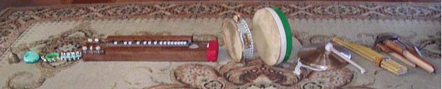 (左から)祭礼用鈴、リトミカ、おもちゃのすず、大正琴、アラブのタンバリンと太鼓、中国のドラ、タイのケーン、アイヌの竹琴